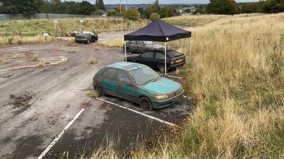 Reform are pushing back on this alleged cultural erasure with hate. There is no limit to what they can hate. They even seem to hate the UK itself, literally referring to is as lawless, as if we are stuck in a violent doom loop beyond hope. Luckily our culture isn’t yet eroded enough to stop us from making movies: I just watched the most recent 28 Years Later film, which depicts a UK that is isolated and decaying because it has been overrun with a ‘rage virus’ for nearly three decades. No one can get in or out; the country is totally self-sufficient and men are made by hunting the infected. It’s like a bizarre mixture of what Reform want for the future (which I guess is sovereignty no matter the cost), but also what they want us to believe about the present (That the UK is dangerous and diseased). Here is a shot of a car park from the film: